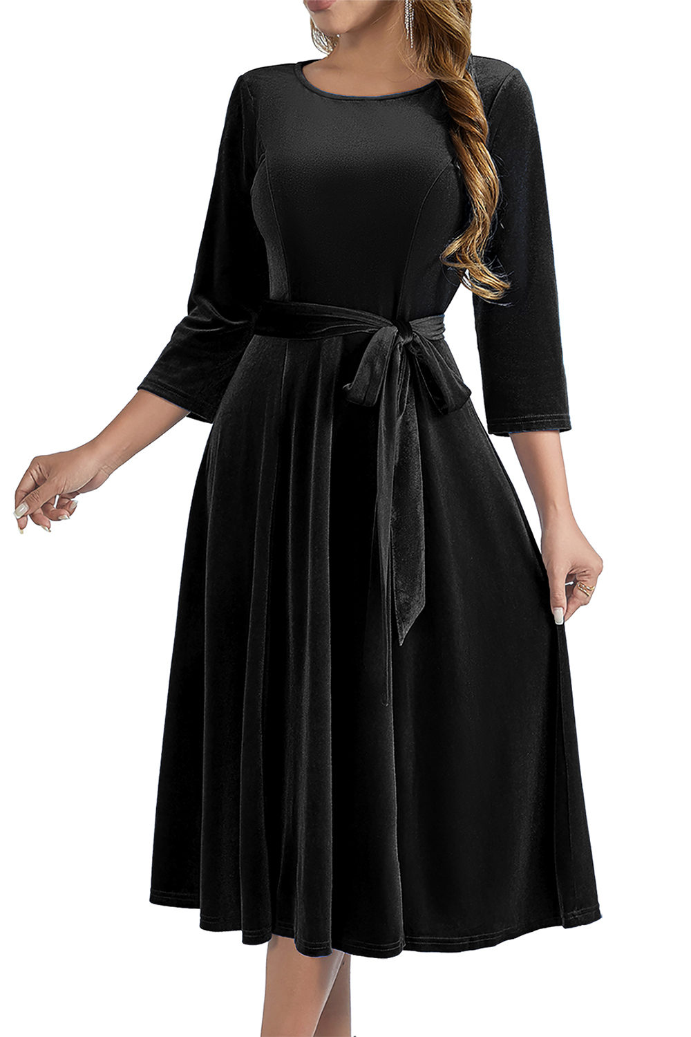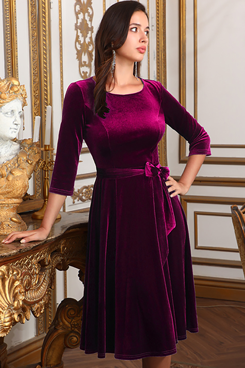 Elevate your wardrobe with this elegant round-neck velvet midi dress, featuring a stylish bow-tie detail, flattering ruched design, and 3/4 sleeves. Crafted from soft velvet, this dress is perfect for formal occasions or evening outings, offering a sophisticated look and timeless appeal.