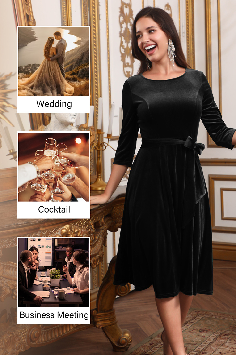 - Sophisticated Design: The dress features a refined round neck, 3/4 sleeves, and a chic bow-tie detail, adding a touch of elegance to any occasion.