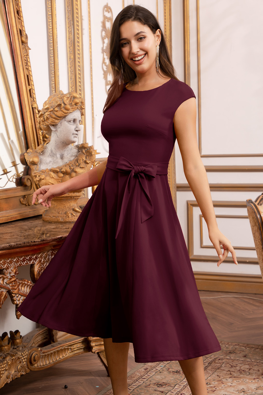 • A-Line Knee-Length Burgundy Cocktail Dress with Cap Sleeves, Vintage Style, Unique and Elegant