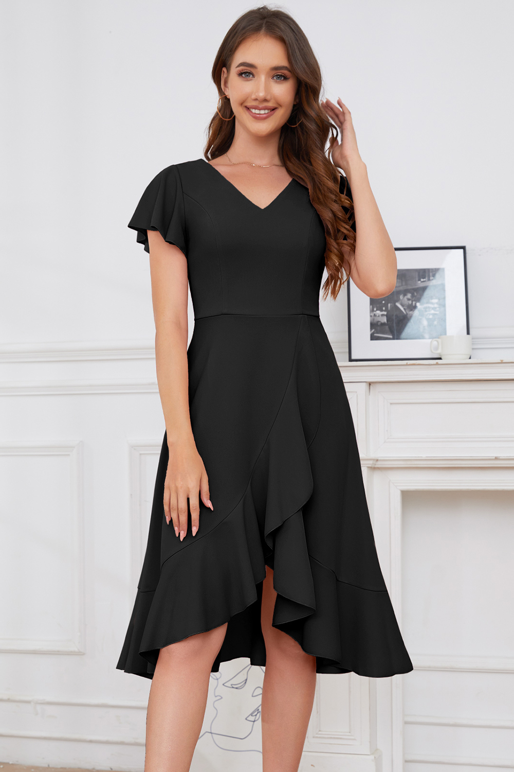 Modest Asymmetrical Black V-Neck Ruffle Sleeve Wedding Guest & Cocktail Dress