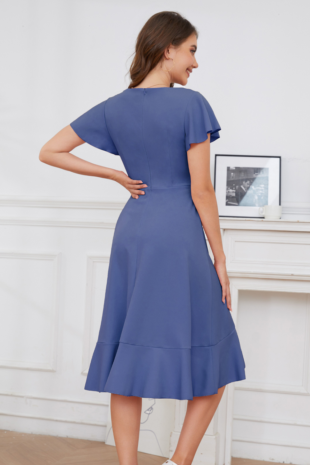 Modest Asymmetrical Grey Blue V-Neck Ruffle Sleeve Wedding Guest & Cocktail Dress