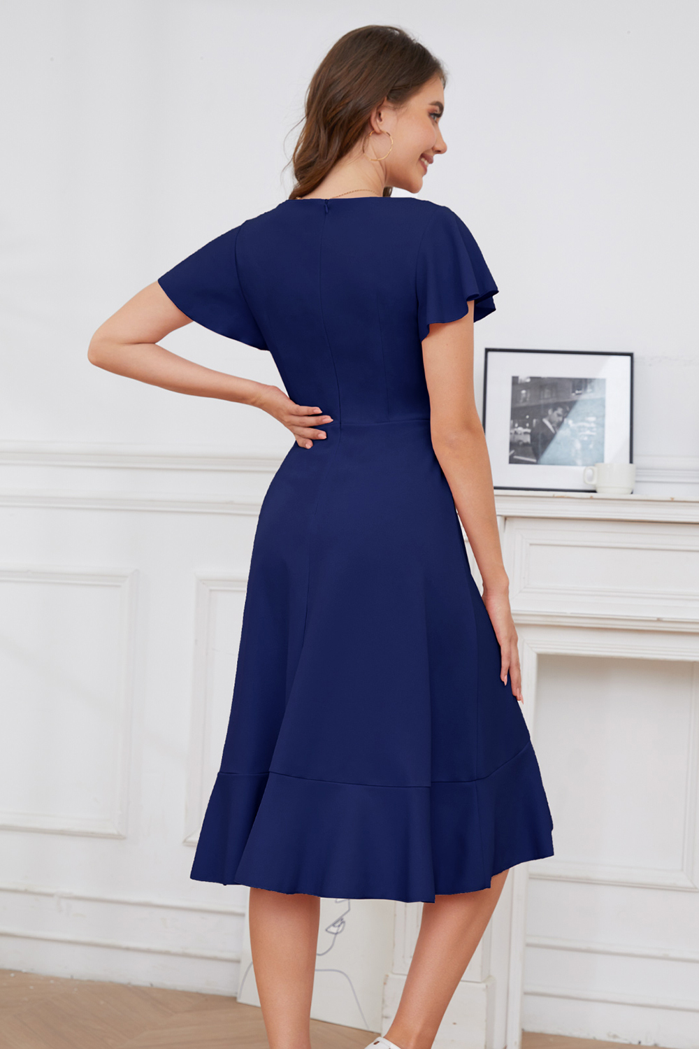 • Modest Asymmetrical Navy V-Neck Ruffle Sleeve Wedding Guest & Cocktail Dress