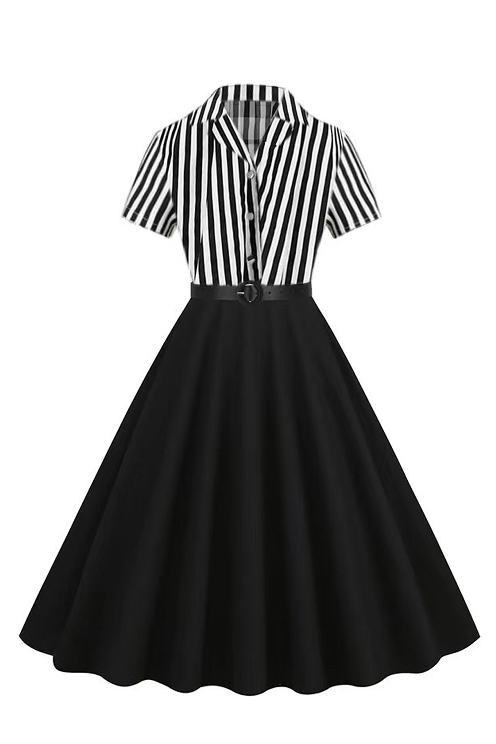 Elevate your wardrobe with our stylish black and white striped A-line dress featuring a sophisticated shawl collar and button details. Perfect for casual outings or dressy occasions, this dress combines comfort and elegance, ensuring you look effortlessly chic.