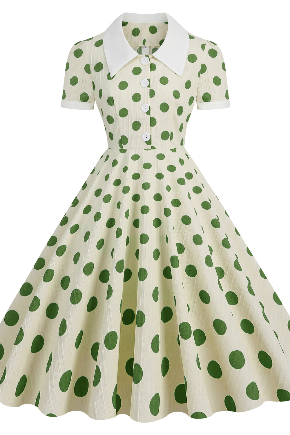 Darling White 1950s A-Line Swing Dress | Green Polka Dot Lapel
