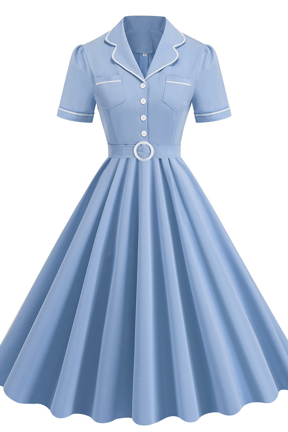 Vintage Elegant Blue A Line 1950s Swing Dress with Belt