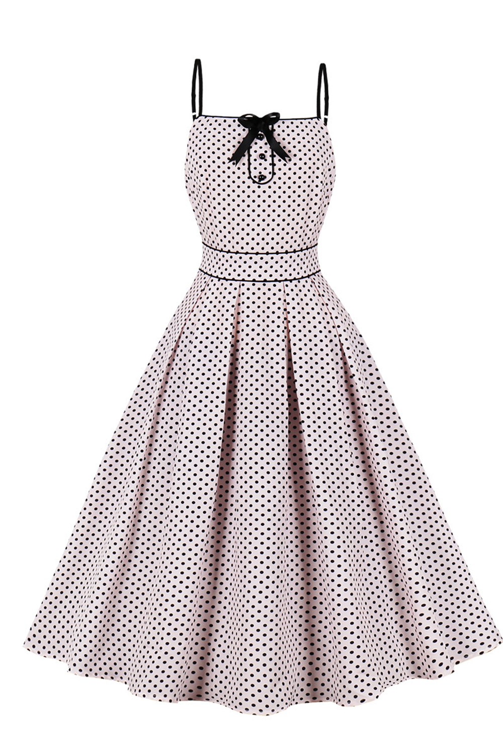 Vintage Light Pink 1950s A-Line Spaghetti Strap Swing Dress | Black Polka Dot