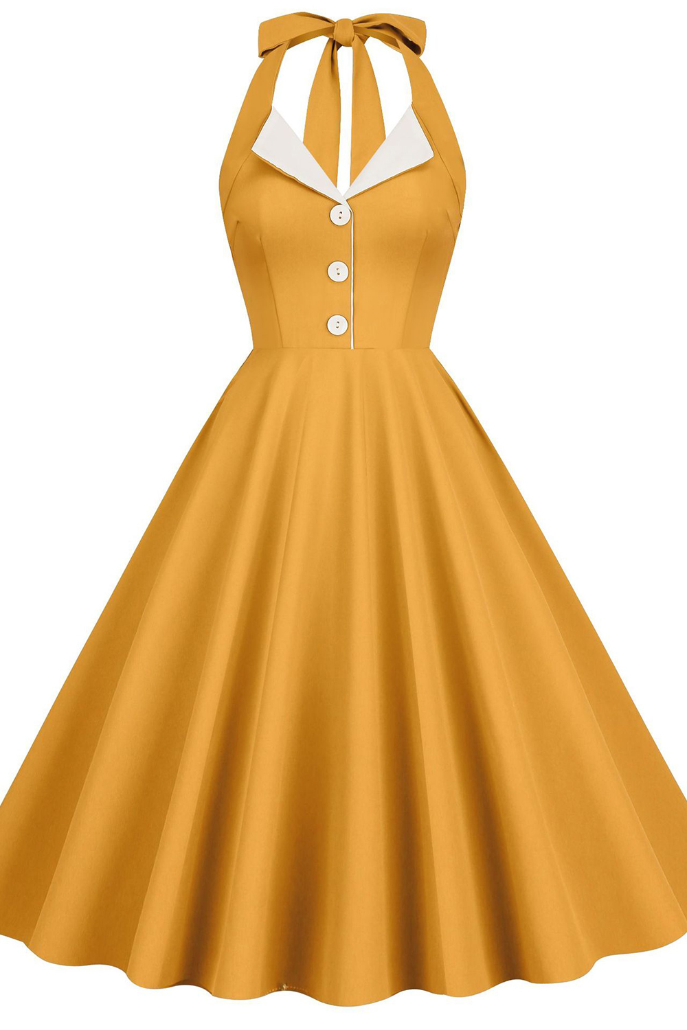Vintage Yellow 1950s A-Line Swing Dress | Flirty Halter Neckline & Lapel