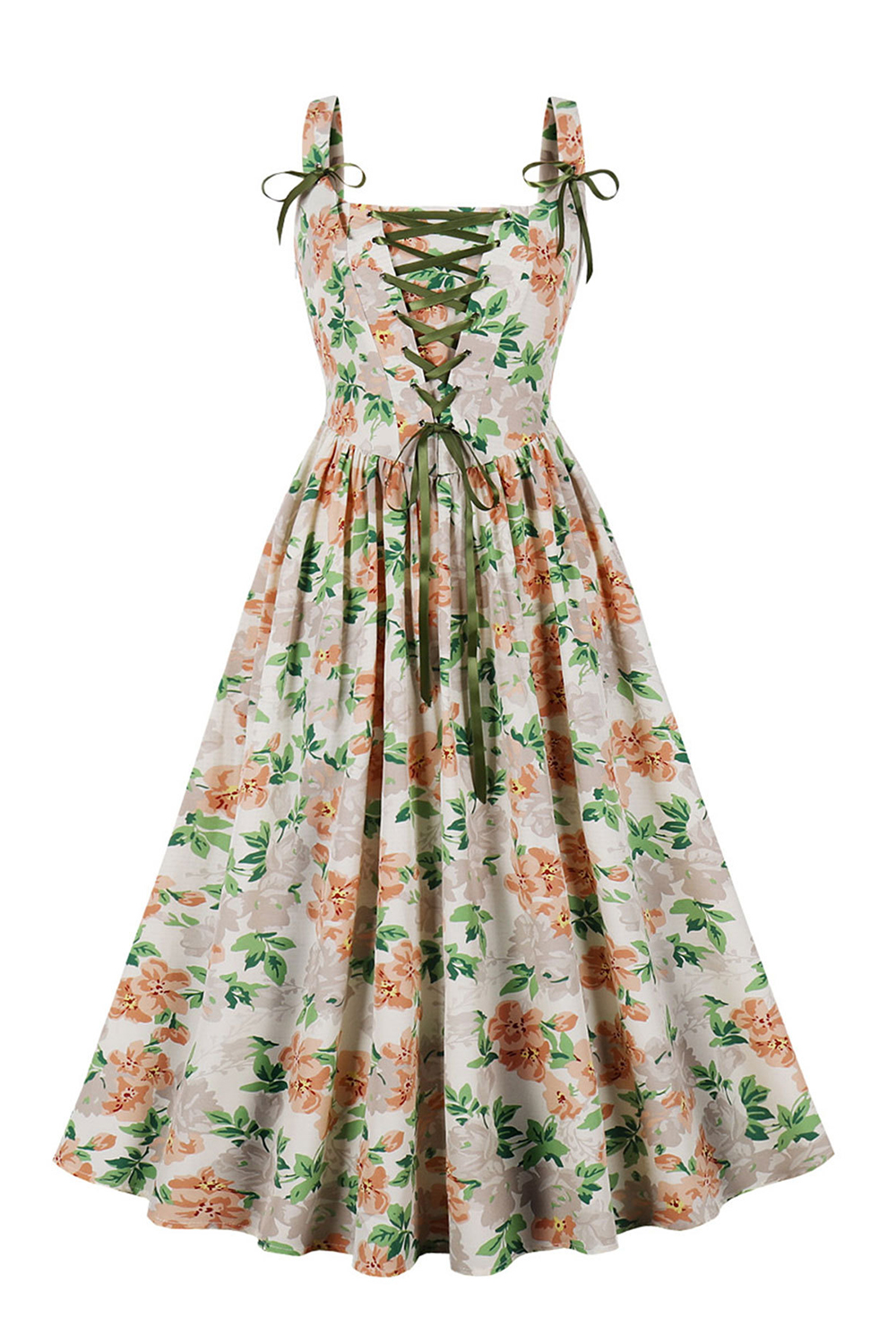 Vintage Green Floral Long Sleeve Midi Dress | Square Neckline