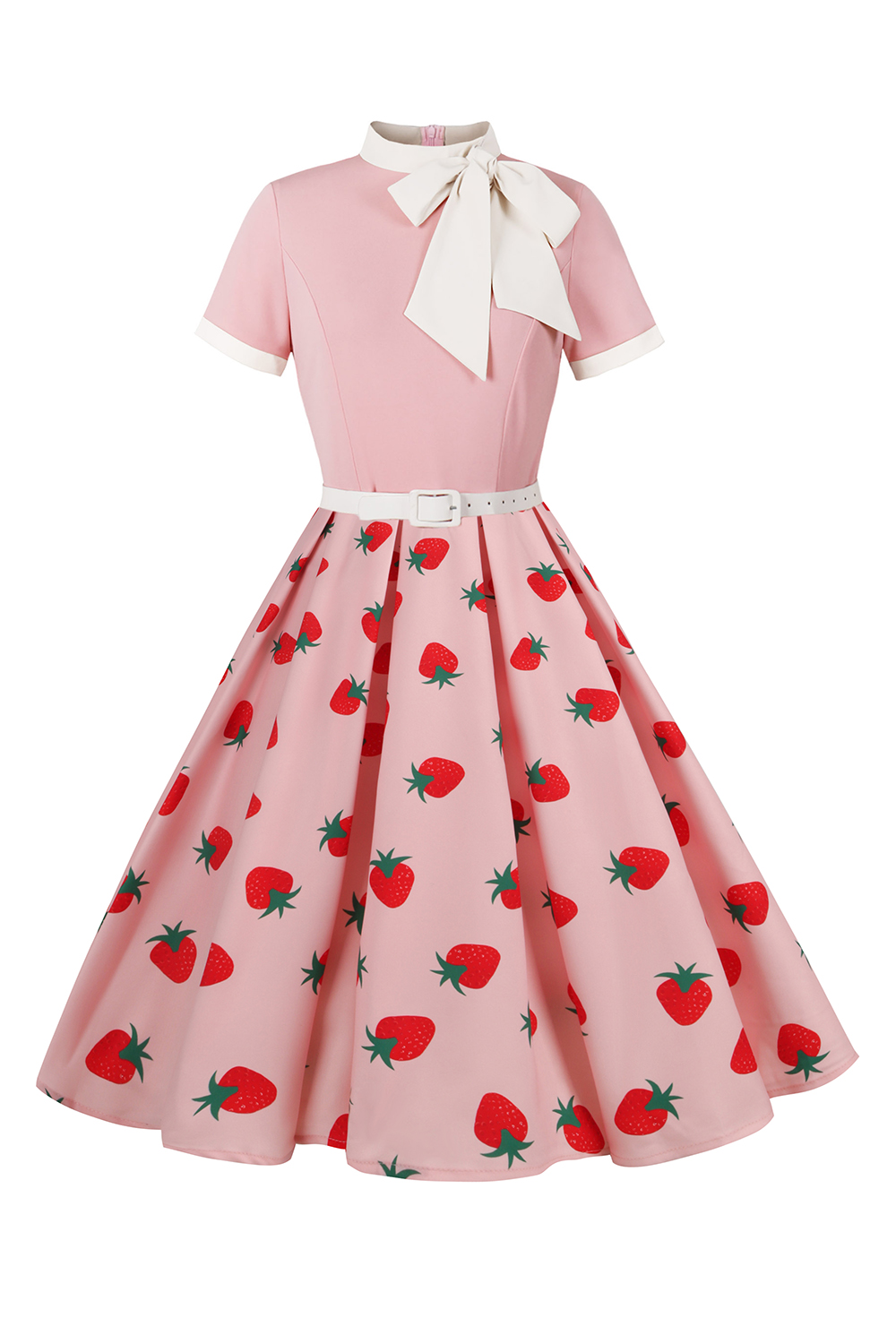 Glamorous Strawberry Tea Dress with Bow Tie Scarf