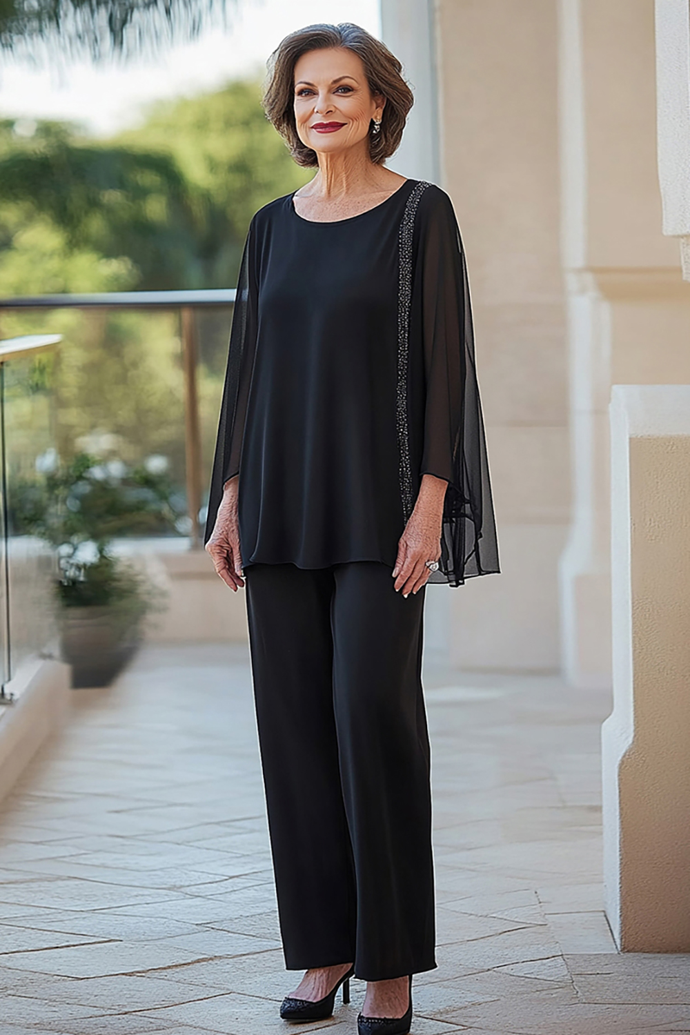 Black Round Neck Chiffon Long Sleeves 2 Pieces Mother of the Bride Pant Suits