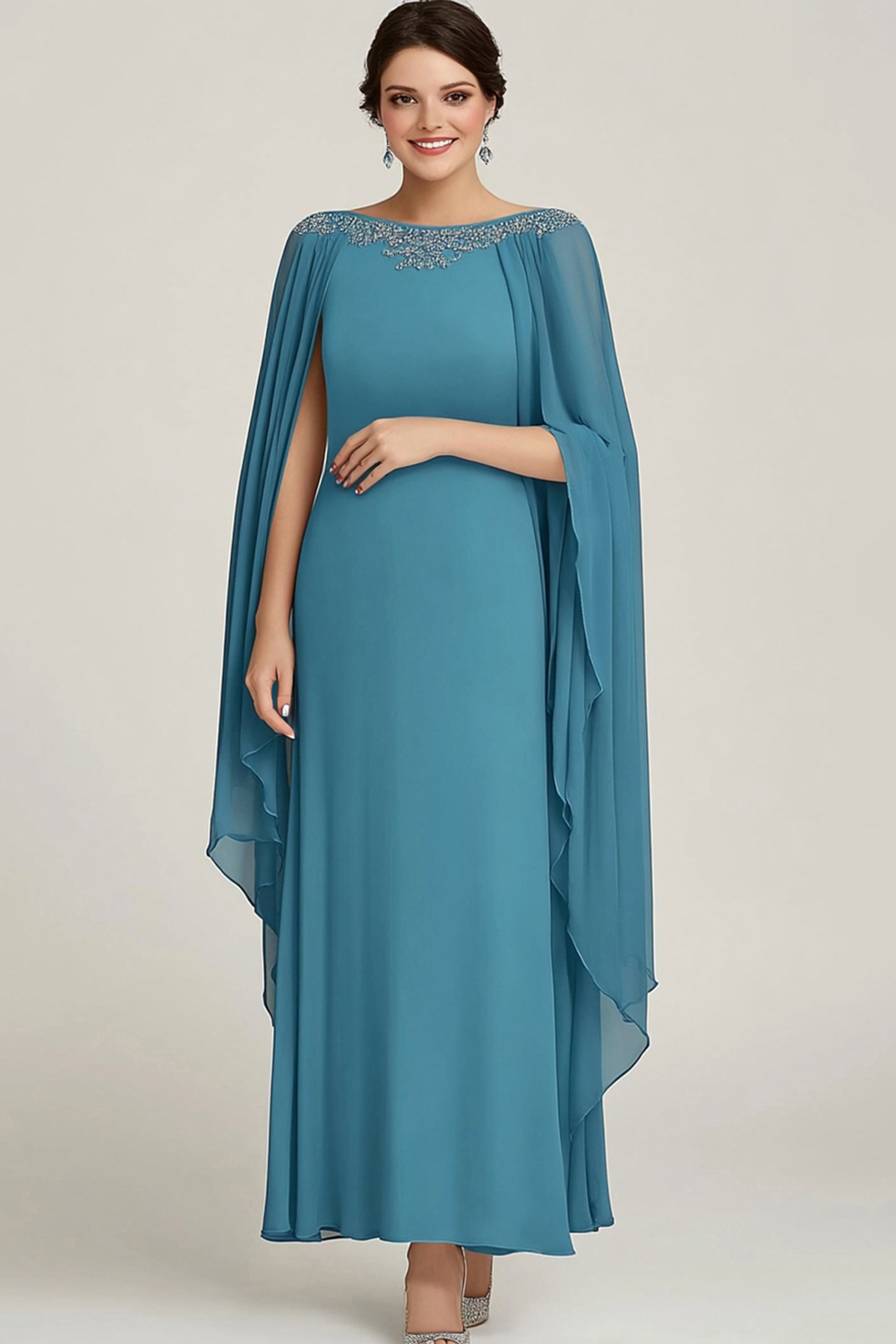 Blue Chiffon Boat Neck Long Mother Of The Bride Dress with Wrap