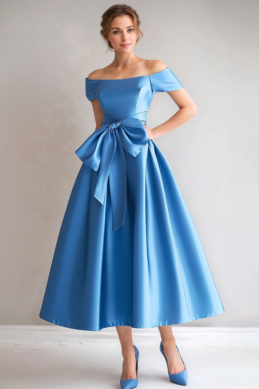 Blue Off the Shoulder A-Line Satin Tea Length Mother Of The Bride Dress with Bow